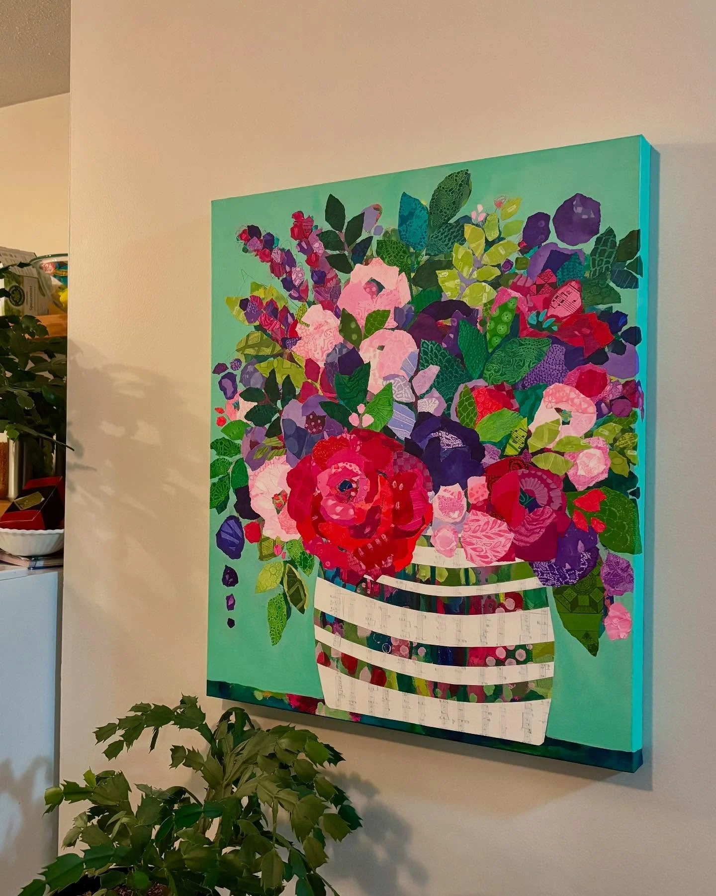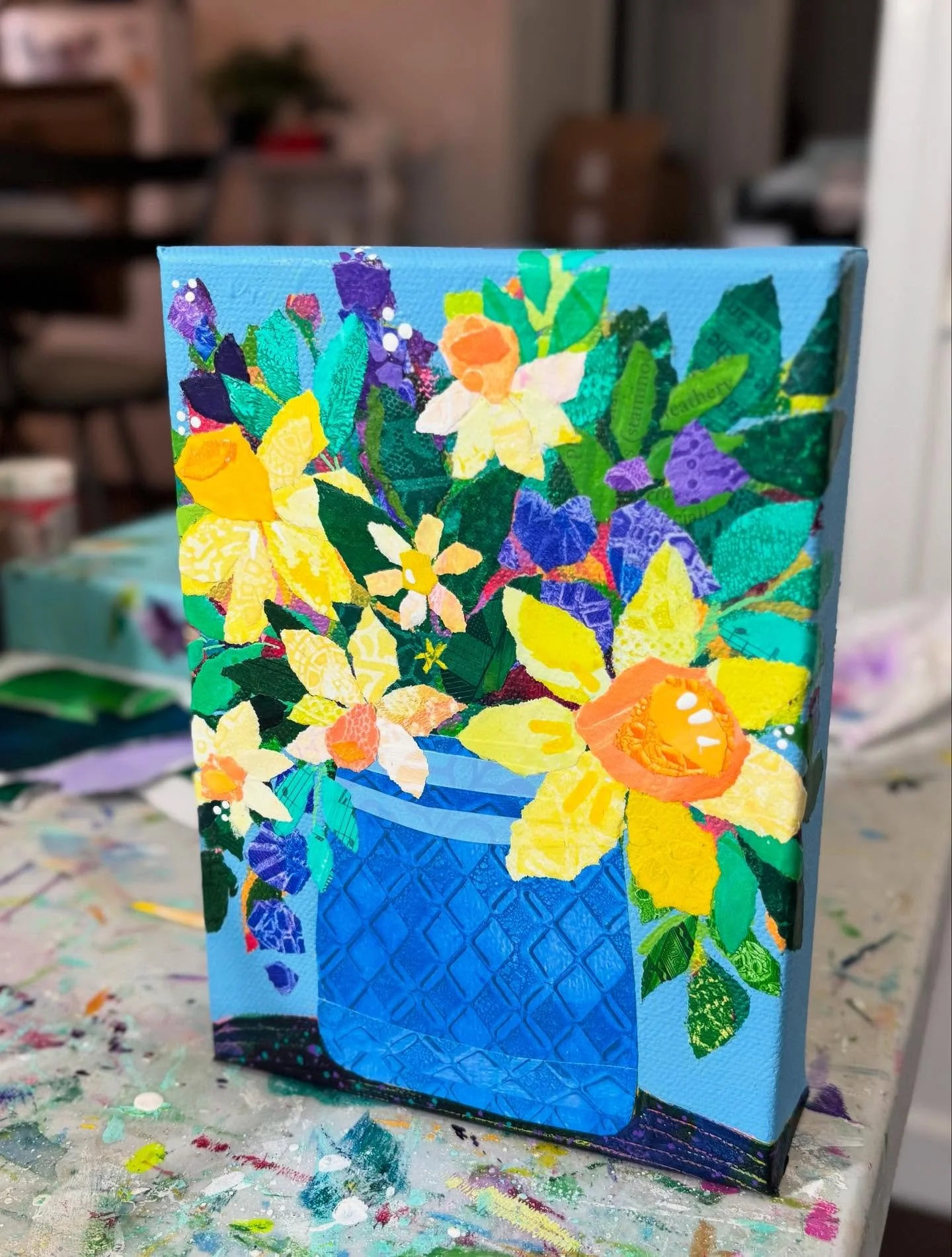 If you look closely, you'll notice paper collage adding unique texture and detail to my artwork. Each collage paper is hand-painted or printed, carefully torn, and then thoughtfully layered onto a painted canvas.